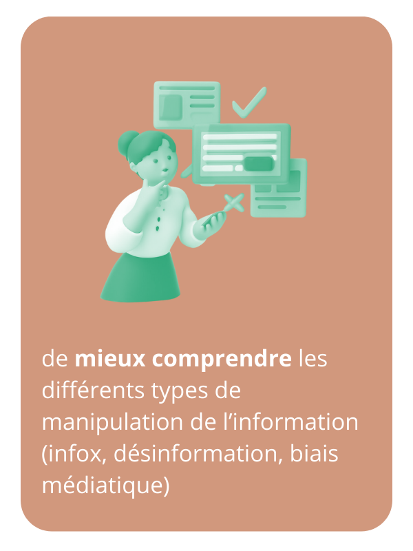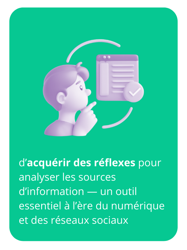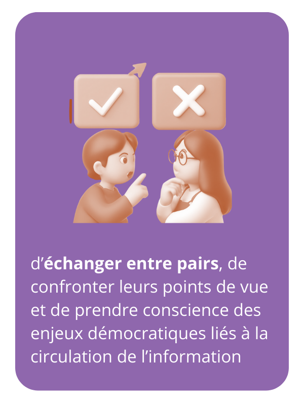 L’objectif de cet atelier : faire découvrir, de façon ludique et participative, les mécanismes de la désinformation, apprendre à repérer les faux contenus, discerner faits et opinions, et réfléchir aux enjeux de la confiance dans les médias et les institutions.