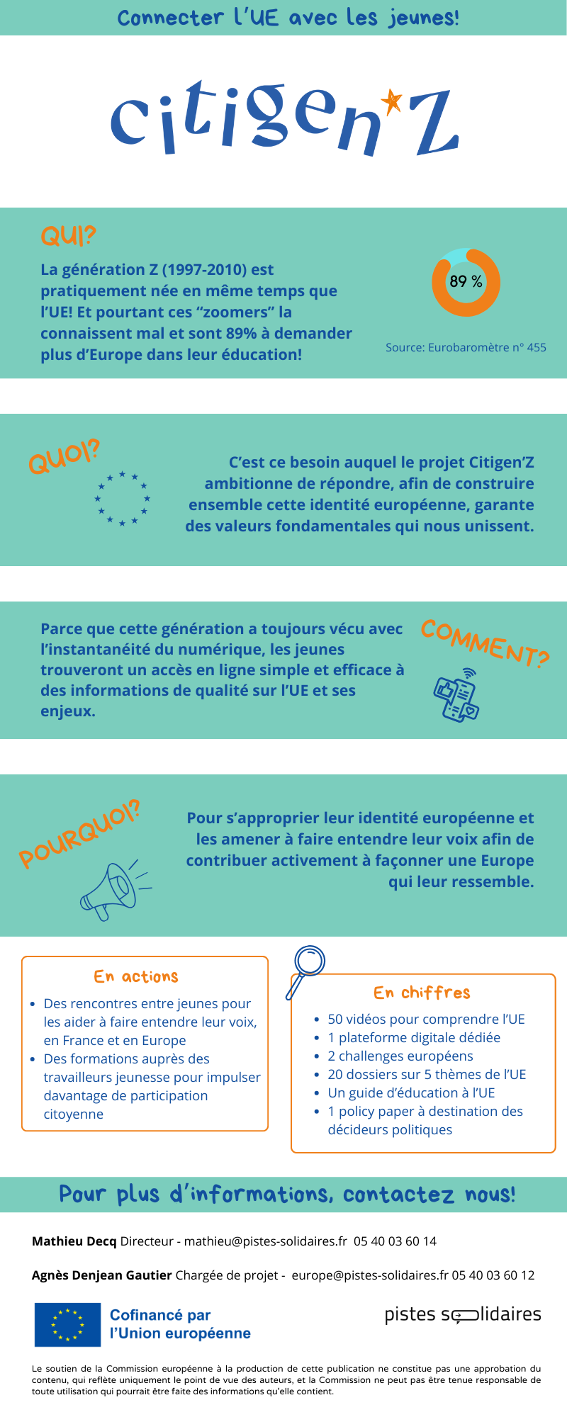 EU Citigen’Z est un projet qui vise à éduquer les jeunes sur l’Europe, à promouvoir le développement de la citoyenneté européenne et leur participation civique de manière dynamique.
