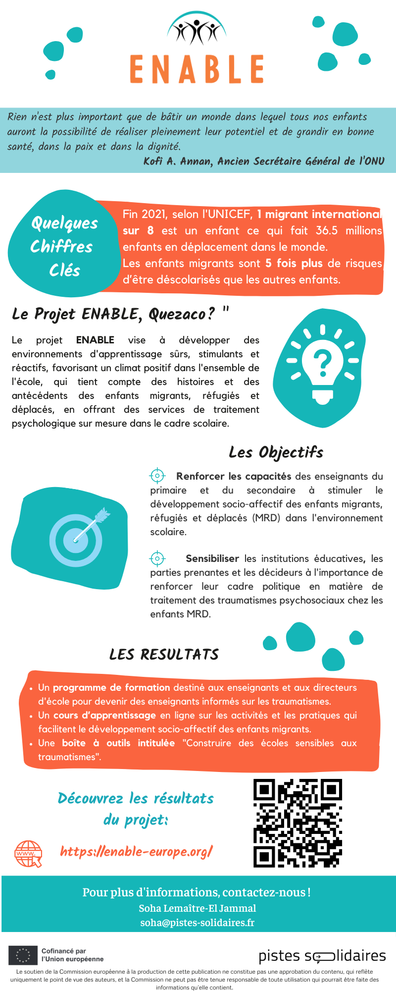 Le projet ENABLE vise à développer des environnements d’apprentissage sûrs, stimulants et réactifs, favorisant un climat positif dans l’ensemble de l’école, qui tient compte des histoires et des antécédents des enfants migrants, réfugiés et déplacés, en offrant des services de traitement psychologique sur mesure dans le cadre scolaire.