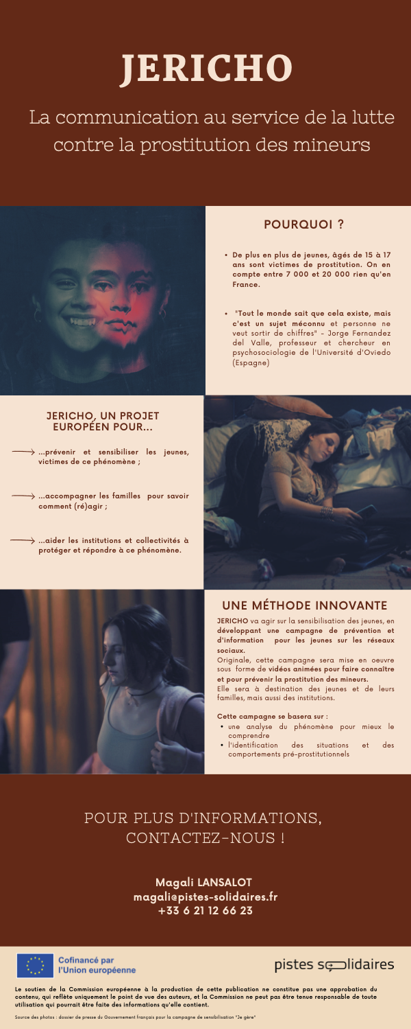 JERICHO entend contribuer à parler de ce type d’exploitation sexuelle de mineurs, le rendre visible et connu du plus grand nombre et soutenir celles et ceux qui en souffrent en développant des ressources de prévention et d’orientation des victimes comme de leur famille.