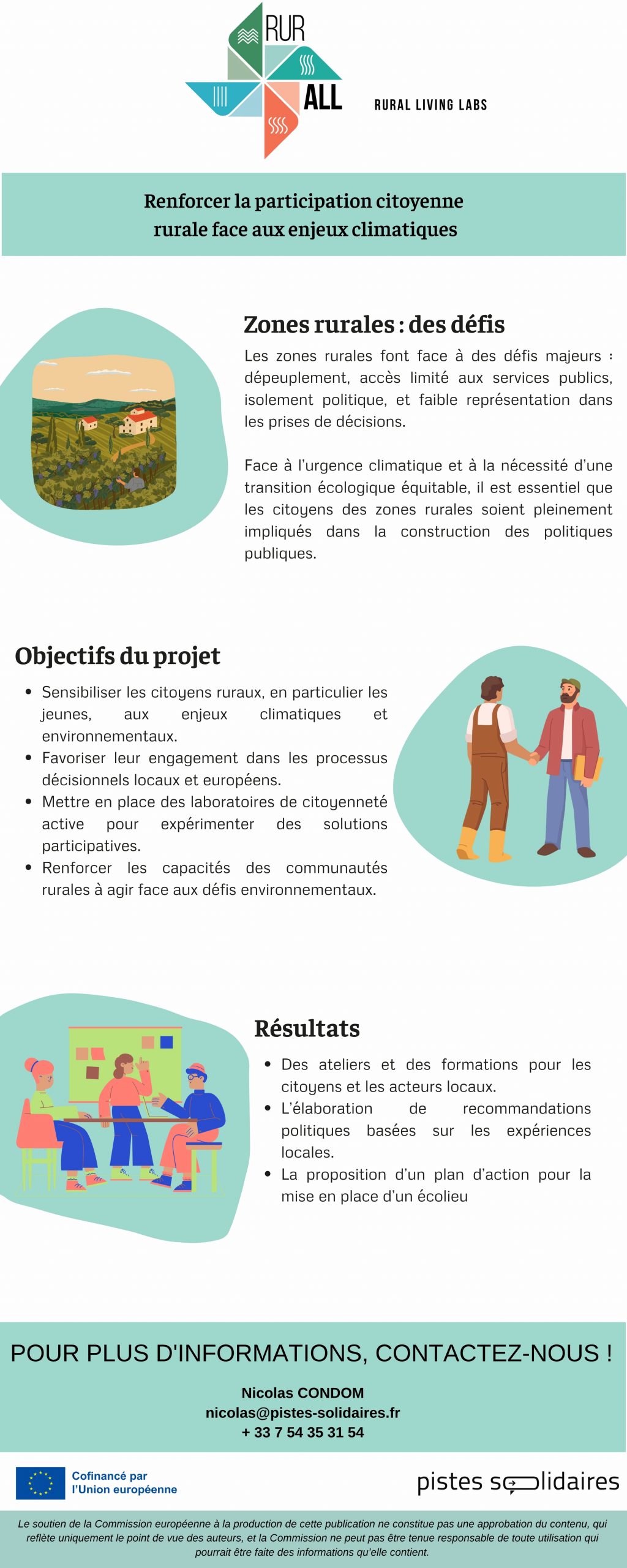 Le projet RurALL s’inscrit dans ce contexte en visant à renforcer la participation citoyenne rurale, notamment dans les décisions liées au climat. En créant des espaces de dialogue, de réflexion et d’action collective, RurALL cherche à outiller les habitants de ces territoires pour qu’ils deviennent acteurs du changement. Il entend ainsi réduire le fossé entre zones urbaines et rurales en matière de citoyenneté active, en valorisant les savoirs locaux, les pratiques durables et l’innovation sociale au service de l’intérêt général.