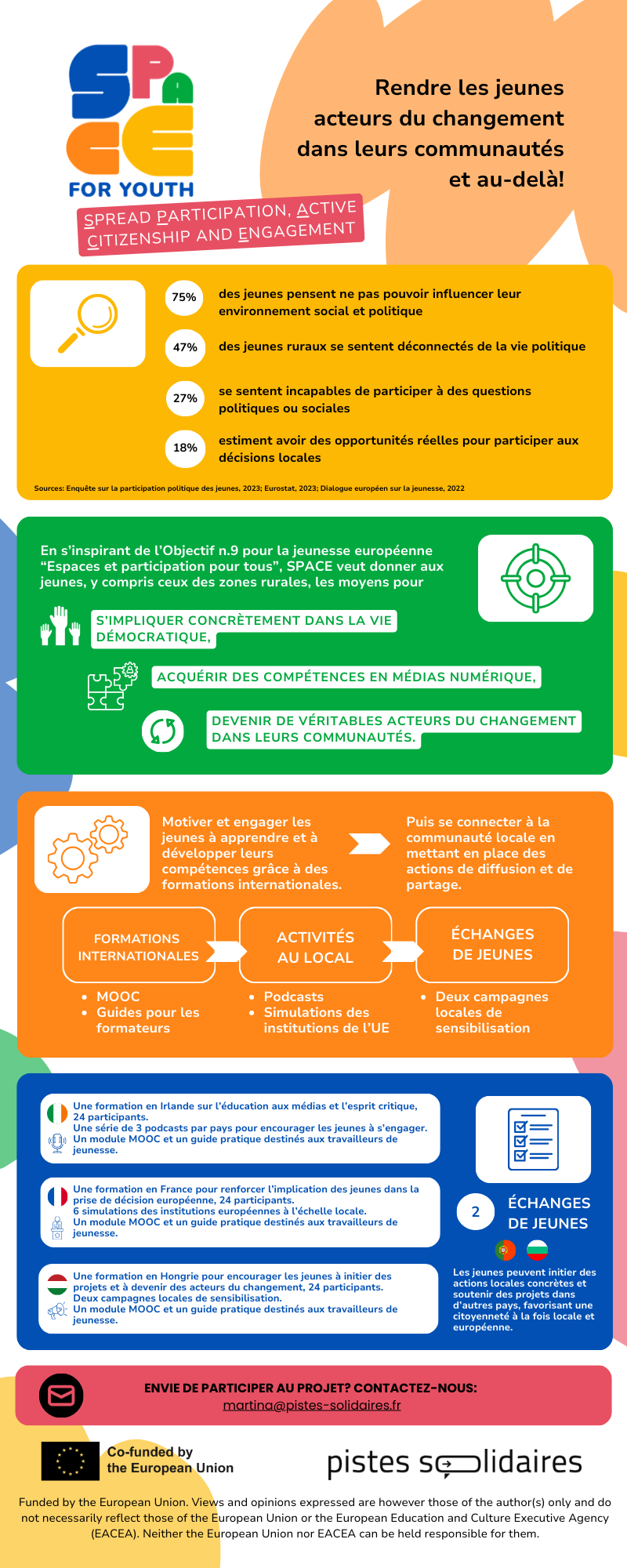 C’est pourquoi le projet Erasmus+ SPACE for Youth – Spread Participation, Active Citizenship and Engagement a été développé. En cohérence avec la stratégie jeunesse de l’Union européenne 2019-2027 et l’objectif jeunesse n°9 consacré à l’espace et à la participation pour tous, le projet vise à encourager l’engagement des jeunes dans la vie démocratique et à renforcer leurs compétences citoyennes et numériques.